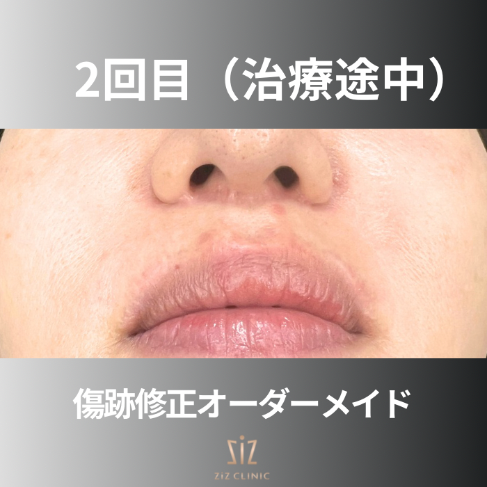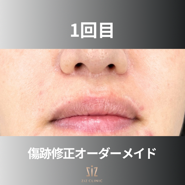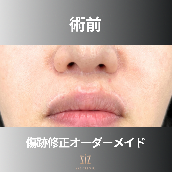 鼻の下とリップ上の縁に白い切開線の瘢痕と縫い跡の段差が目立つ状態です。