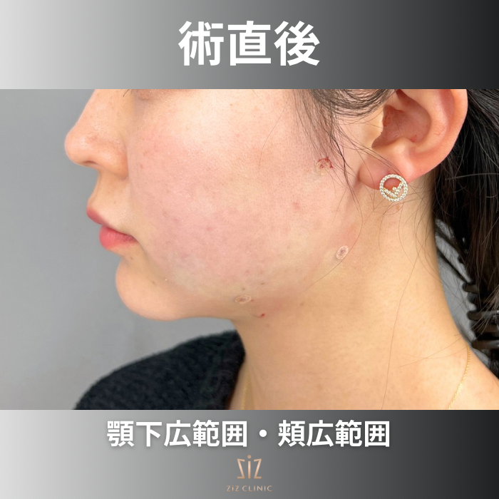 切らずに20分で頬と顎下を広範囲に脂肪除去していますが、マリオネットラインは取り残しが多い部位なのでフェイスラインの方からにアプローチを変えて施術しています。